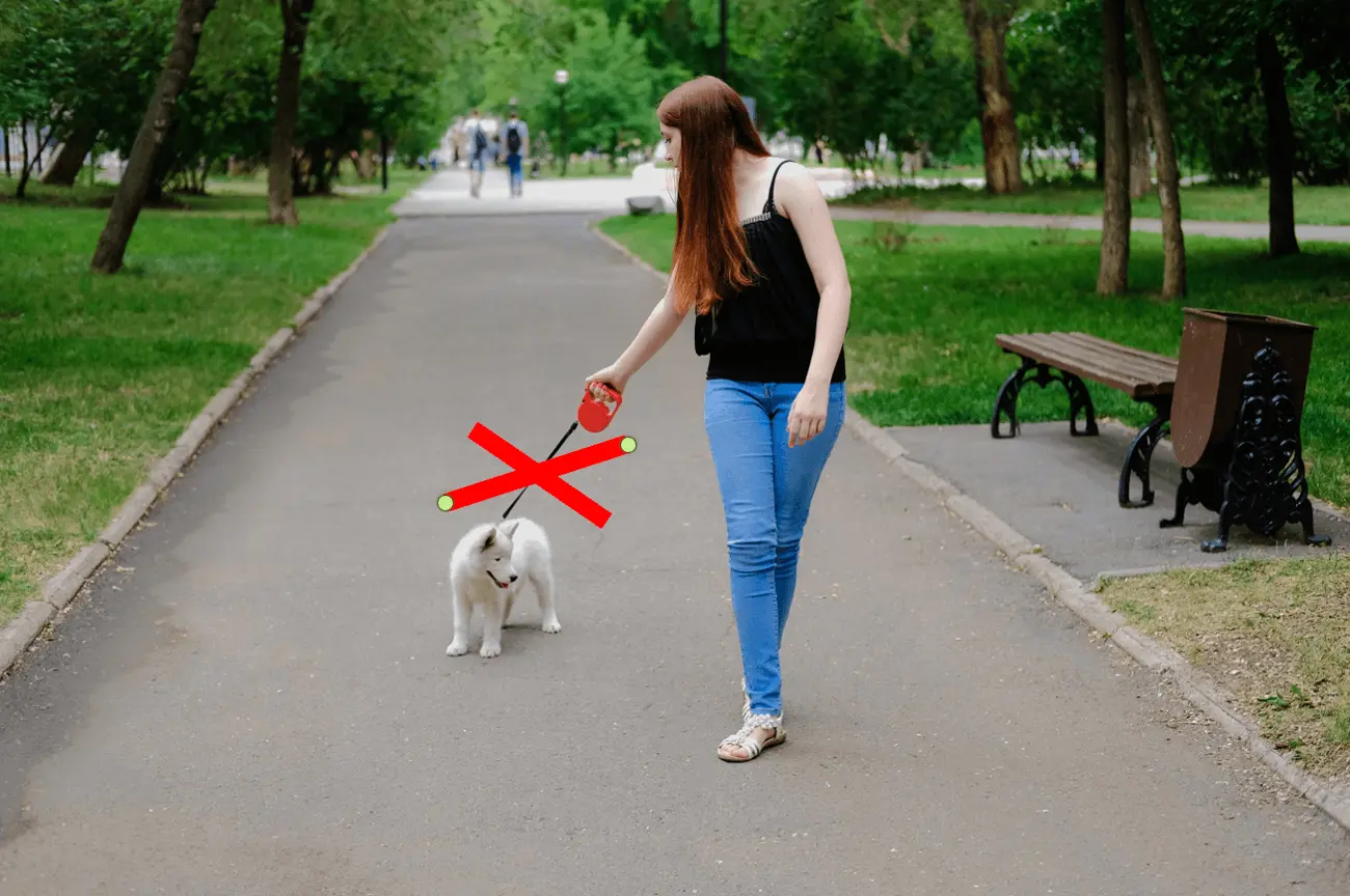 The other issue are these extendable leashes. Please do not use them. They are so dangerous and this constant pulling on the dog’s neck is horrendous. Both images above portray this.