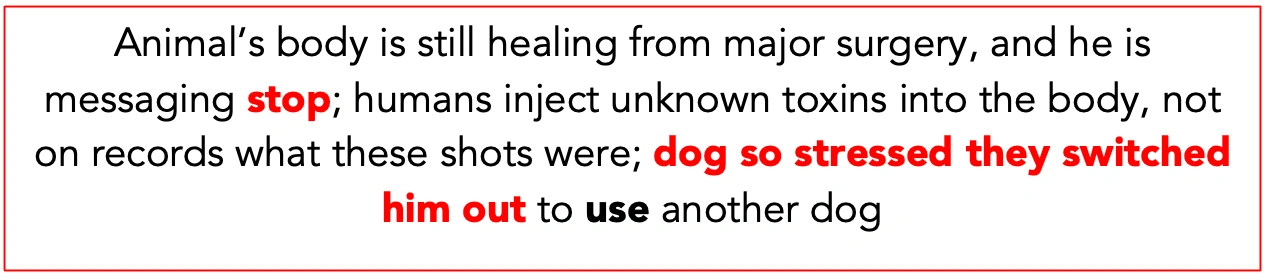 What is important to note is the list above is what went into the body at a different facility before this dog was farmed out for experimentation just eight days prior, as well as major surgery. This is the annihilation of the physical body and energy fields. Just because this is accepted “as normal what we do to animals” does not mean ANY of this is healthcare or in the best interest of an animal to live a long happy pain free life.