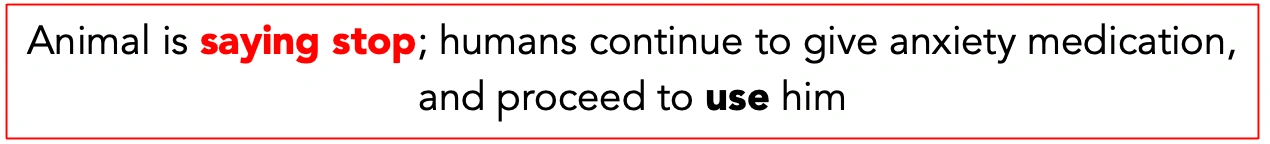 So many humans exploiting this beautiful animal’s body, mind, spirit and soul, all in the name of “practise”. Where is humans’ creativity to learn different ways, to demand no harm and yet still learn. Where is this drive? What concerns me most, is every being participating in this process has no knowledge of what is in these needles, nor the impact on the body short term or long term. This is not practising do no harm by any of these facilities.