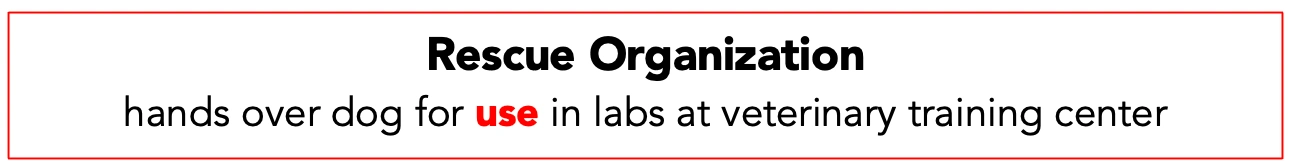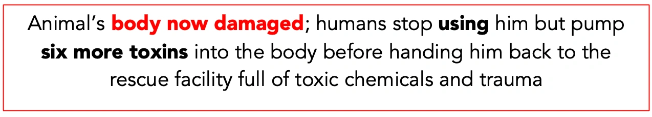• Dog is now discharged as of no use anymore, body is damaged, he is then sent back to the rescue after enduring all this trauma to be adopted out full of chemicals and trauma
