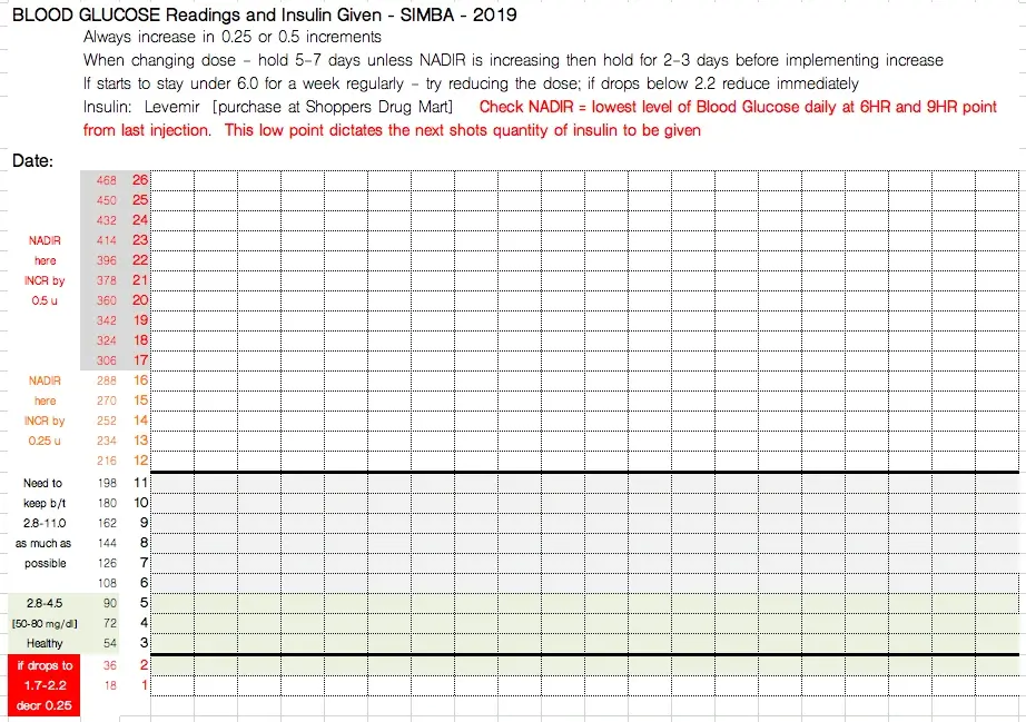 Below, please find the final log we were using for Simba in 2019. We were running on 0.25 units with increments of 0.25 if she “hypoed”. We kept this on the counter, then updated the spreadsheet on the computer to see her trends. This data was also fed to DCI for another perspective and dosing feedback.