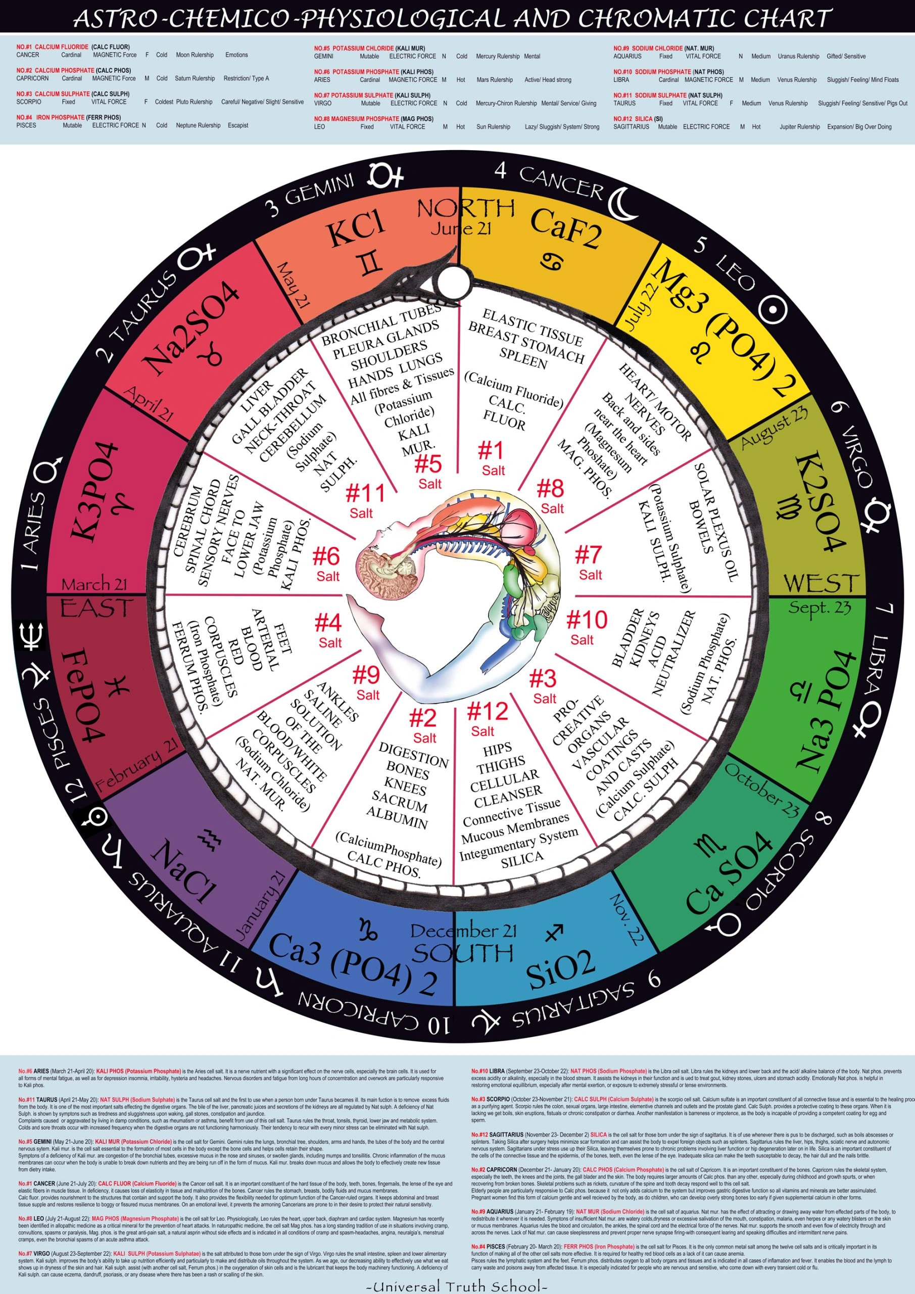 The chart is devised into twelve months, with the twelve zodiac signs, and each salt is assigned a month. The chart is used counter clockwise. The idea is human beings are in gestation for 9 months, therefore a being will automatically be short 3-4 salts as they missed the other months inside the womb.