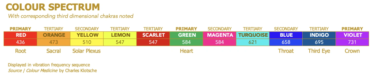 The following is a list of the colours used in the healing process of the aura, the energetic fields, and the physical body. Each colour is either warm, neutral, or cooling, and each have different effects on the life form being worked on, as they each have their own specific healing attributes, contributions one might say. These contributions are listed below. The vibration per second of each colour is also noted where known, courtesy of Charles Klotsche’s work in his book, Color Medicine.